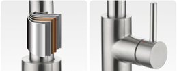 Nichelul confera otelului o rezistenta crescuta si maleabilitate, cromul ajuta otelul sa reziste la coroziune iar molibdenul adaugat in aliaj (2-3%) adauga o rezistenta crescuta la acizi. Din cauza durității ridicate a materialului din oțel inoxidabil, este dificil de fabricat și procesat, ceea ce afectează serios producția de masă a bateriilor din oțel inoxidabil, astfel încât prețul robinetului din oțel inoxidabil 304 real este mai mare decât cel al aliajelor de cupru-zinc.